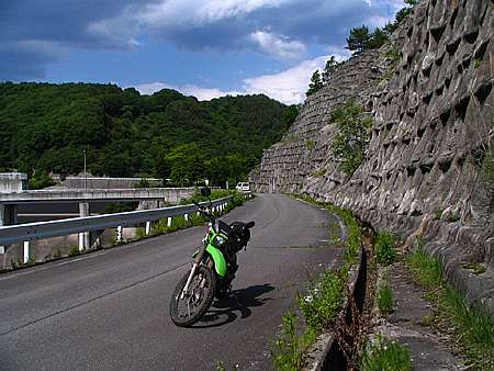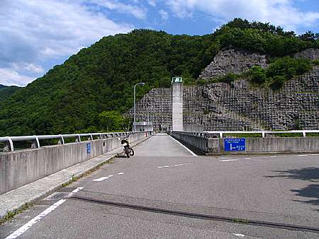 午後2時37分 ダム湖の名称は清里湖。 清里高原に由来するそうだ。それほど巨大というほどではないが北から東へと長く続いている。 さてここからは大和地区へ向かうことにする。 道はダムに突き当たった場所で二又に分かれ、左へ進むと国道へ戻ってしまうので右折してダム上の道へと進んで行く。 |