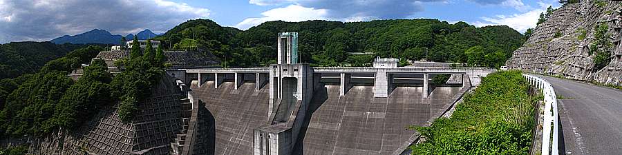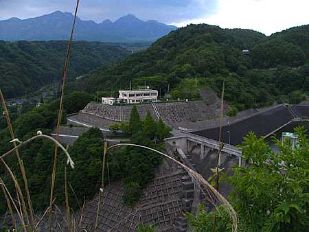| 午後2時40分 ダム本体はこんな感じ。 左側の一段高い場所に建つのがダム管理棟。 その上には八ヶ岳が顔を覗かせている。 |