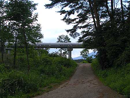 午後2時50分 ダムからの道は、ダムの南東に位置する1087.5m峰を巻くようにして東へと下っていく。きわだって景色の良い道ではないが、時おり木々の間から甲斐駒ヶ岳が顔を覗かせる。 ダムから約2.6キロ。 分岐道の先になにやら人工物が建っていた。 遠目にはなにかの通路のようにも見えるが、どうやらダム発電施設への水送管のようである。 |