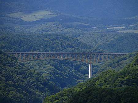 | 午後2時52分 せっかくなので水送管まで行ってみた。 と、目の前には巨大な八ヶ岳。その下には清里高原道路の八ヶ岳高原大橋も見て取れる。 ちなみに八ヶ岳高原大橋の長さは490mで高さは110m。 川俣渓谷を一気に跨いでいく大橋で、橋上では八ヶ岳や富士山など素晴らしい景色が広がっている。 残念ながら橋上は駐車禁止だが、直ぐ先には専用の駐車場が設けられており、多くの観光客が徒歩で橋を渡っていく。 |