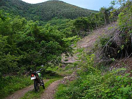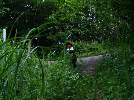 | 午後5時47分 見晴台で30分ほど休憩したあと、自衛隊顕彰碑から分岐する支線へと入ってみた。 支線の道幅も約1.5車線ほど。 本線と同じく草道になっており、場所によっては背丈ほどもある草を掻き分けながら進んでいく。 |