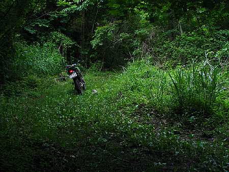| 午後6時35分 結局は約1.3キロほど進んだ空き地で行き止まり。 空き地の広さは10m四方ほどだろうか。周囲は山に囲まれておりなにもない場所だ。 |