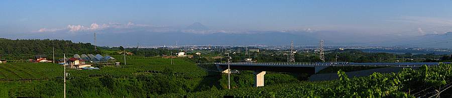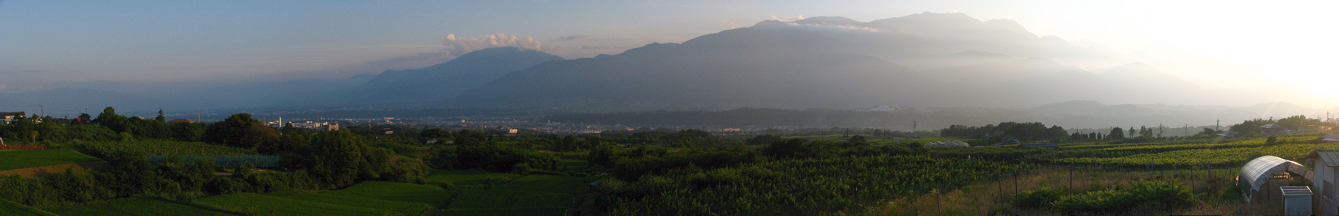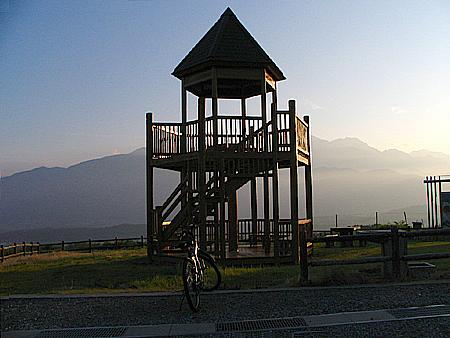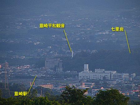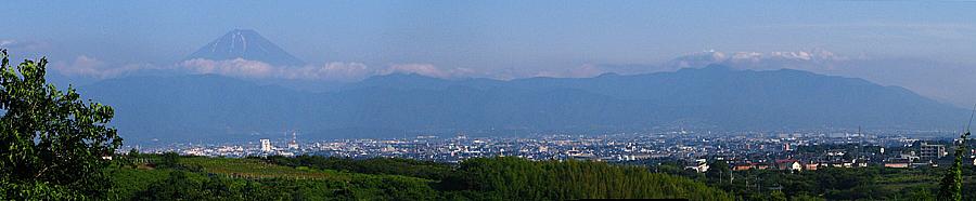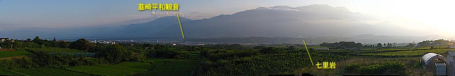 午後6時30分 見晴台からは正面に長く横たわる七里岩を見おろせる。 自身は見たことはないが、夜になると列車の灯りがその七里岩を駈け上っていく姿を見ることができるそうだ。 七里岩の上に見えるのは巨大な甲斐駒ヶ岳や鳳凰三山、甘利山や櫛形山といった峰々。その手前には韮崎市街の町並みが広がっており、韮崎平和観音やJR中央線の韮崎駅も見通せる。