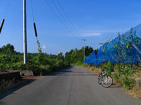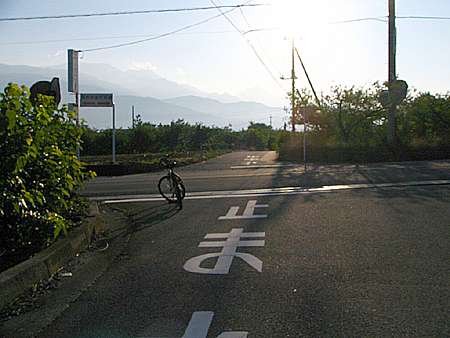 午後5時17分 双葉町からは県道616号で韮崎市へと向かう。 ちなみに自転車は近くのホームセンターで買った折り畳み自転車。 1年ほど前に19800円で買ったのだが、なんとその翌週の特売チラシでは半額以下の9800円。そりゃないぜ..... |