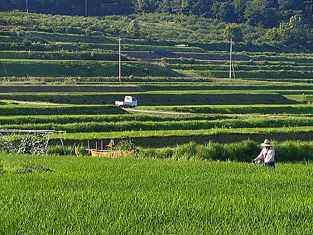 | 午後5時5分 双葉町大垈地区。 緩やかな傾斜地帯には遙か先まで水田地帯が続いている。 遠目に見ると色鮮やかな緑の絨毯だ。 |