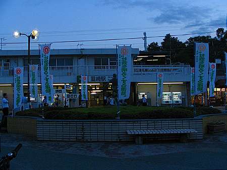| 午後7時01分 韮崎駅へ到着。 駅舎の背後に見えるのが銀河鉄道展望台からも見えていた平和観音像。関東三観音のひとつに数えられており、韮崎市のシンボル的な存在だ。 さてここからは一気に甲府へ。 県道6号で敷島町、双葉町と走り、甲府へ入るころにはすっかり暗くなっていた。