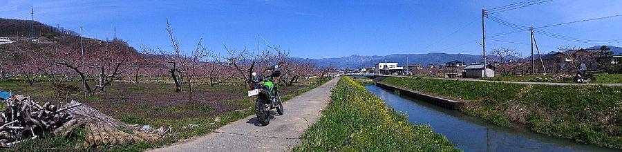 | 午後1時00分 自宅を出発して約20分。 主要道を離れ駒沢川沿いの桃畑へ停めてみました。 この辺りは笛吹市と山梨市の境界付近で、桃の季節になるとピンク色の絨毯が一面に広がります。