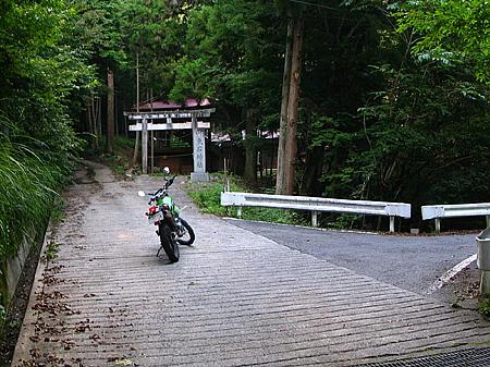 | 午後4時33分 千代田湖から約2キロ。 帯那山林道の起点となる脚氣石神社へ到着。 ここを右折して水ヶ森林道へ上ります。 |