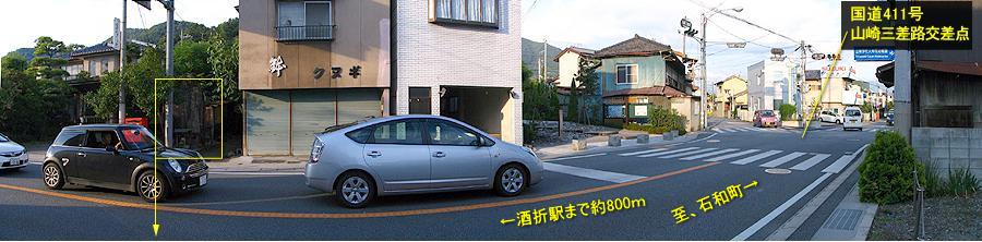 | 午後6時50分 河口湖の最西端にある分岐路。 今回は右の県道21号へ進みますが、左の県道710号へ進むと河口湖を周遊してやがて国道137号へと至ります。 |