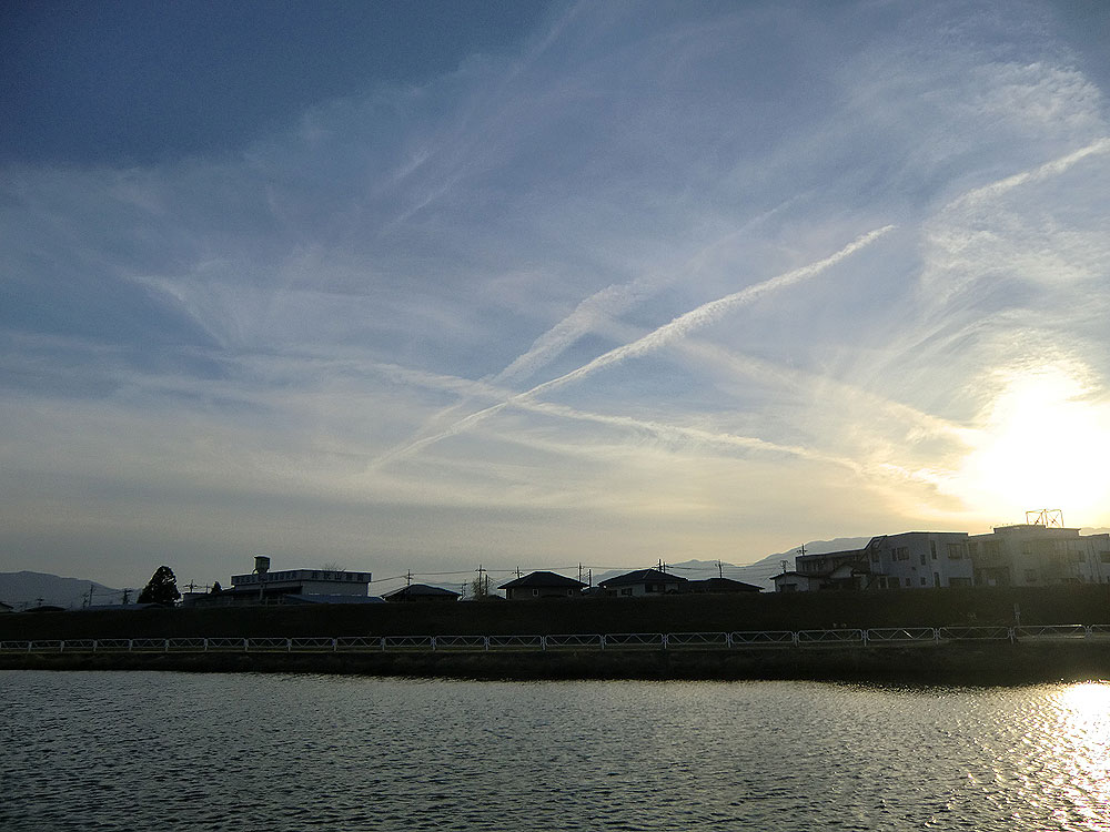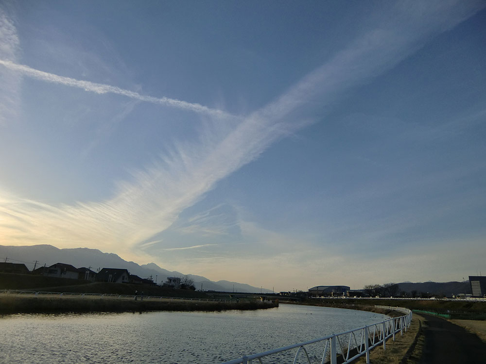 | 2011年3月18日、午後5時前後の雲。 甲府盆地の真上にかかっていた幾筋もの長い雲。 少々奇異に思えたので撮ってみましたが、広範囲に広がっていたので見た方も多いのではないでしょうか。 1週間から2週間前に出ることもあるようなので少々気になるところです。 単なる杞憂に終わってほしいですね。 |