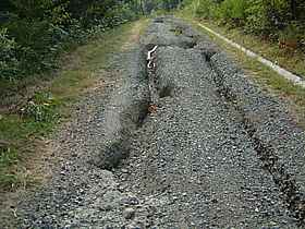 | 県道27号線を北進していくと敷島と甲府の境界を表す看板がある。前山大明神林道に入るには、そこから約300mほど先にある三叉路を左折する。最初は舗装路だが300mほどでダートとなる。道幅は狭い所で1車線強、広い所で2車線。路面は少し厚めの砂利で、当日はクレパスが至る所に走っていた。 | ||