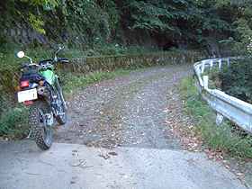 | 小裾辺林道は県道30号線を西進し「釣場」バス停を左折。左折すると橋になっており道なりに約150mほど走ると三叉路に突き当たるので右折。右折して約150mほど進むと上下に分かれる二股路となるので左上へと上る。約300mほどで標石が現れダート路となる。道幅は約1.5車線弱で路面は土と砂利。 | ||
