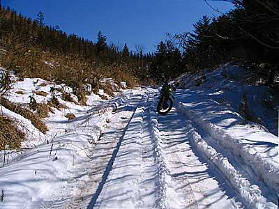 | 午前11時57分 凍結箇所は約100mほどだったでしょうか。 それほど長い距離ではなかったのですが、押したり引いたりの格闘で5分近い時間を費やしてしまいました。 それでもなんとか凍結部分を脱出。 左手には盆地の景色が徐々に広がり始めます。 |