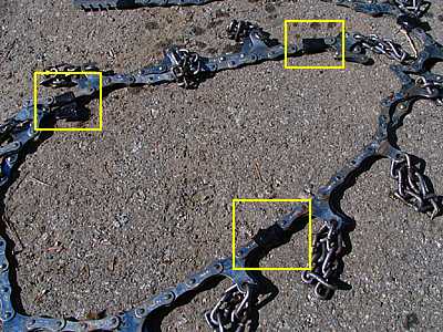 | 午後1時15分 さてチェーンを外します。 ちなみにチェーンは絡むと取り付けるときに大変です。 あっちを捻るとこっちが絡み、こっちを捻るとあっちが絡むで、下手をすると真っ直ぐにするのに30分もかかったりします。 これを防ぐには5、6ヶ所をテープで留めておくと絡まなくなります。30秒もあれば出来ることなので、手間を惜しまずやっておくといいでしょう。 |