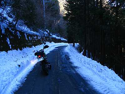 | 2008年2月19日 降雪から10日。 朝から抜けるような青い空。 東西南北の何処を見廻しても雲ひとつない状態です。 こんな日に仕事をしているのは勿体ない、ということで久しぶりに林道と名のつく場所へ行ってみることにしました。 午前10時30分 バイクカバーを外すも、実はバイクに乗るのは1月25日以来です。 バッテリーもそろそろ寿命を迎えつつあり、愚図つくエンジンはなかなか掛かりません。 お湯で暖め始動させるのに約15分。 出発したのは午前10時45分を廻ったころでした。 |