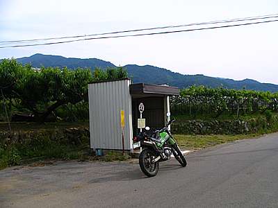 富士急行の神有バス停。 ブドウ畑の広がる道にポツンと建っている。1日の乗降客は何人いるのだろう。 |