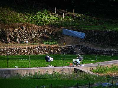 草取りだろうか。 老婆が田圃で作業をしている。 三輪の自転車が可愛い。 |