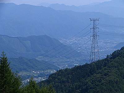 午後5時45分 だいぶ標高が上がってきた。 南東の遠くに見える山は金ヶ岳や曲岳。その遙か手前に見える橋は県道610号の「みずがき湖」を渡る鹿鳴峡大橋だ。 |