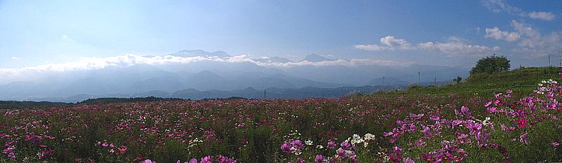 | 午後1時21分 茅ヶ岳広域農道を西進。 若干の雲はあるものの、フラワーセンター前から望む南アルプスはお花畑の上に綺麗に広がっていた。