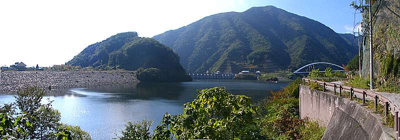 | 午後2時05分 みずがき湖で一息ついたあと、本谷川に架かる増富大橋を渡って湖の裏へと廻ってみた。 写真下の左側に写っている建物がビジターセンターで中央が塩川ダム堰堤。この堰堤の上を県道610号が走っており、右側の鹿鳴峡大橋へと続いていく。 ちなみに県道610号は「みずがき湖」を起点として最終的には信州峠から長野県側へと抜けていく。 |