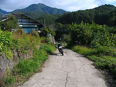 午後4時34分 林道の終点を経て小尾神戸地区へと到着。 このころにはすっかり曇ってしまい、日没とともに少し肌寒さを感じるようになってきた。 |