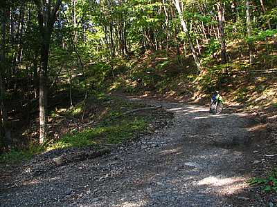 午後2時45分 入り口から約2キロ。 やや勾配の大きな道を上って林道のピークへ到着。 ずっと未舗装路の続く道だが、景色的に冴えないのがちょっと残念だ。 |