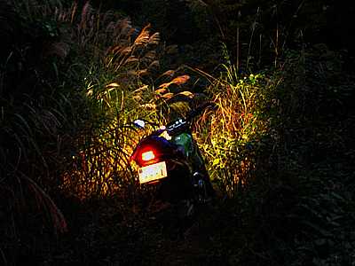 | 午後5時55分 抜けられるのか? 道幅は1.5車線弱ほどあるのだが、廻りは頭上まで木々が覆っている。暗さと背丈もある草で先の道が読めず、いきなり道が途切れていたら厄介だ。 |