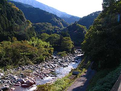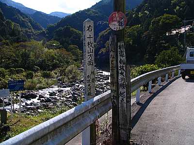 13時15分 南俣川を左手に見ながら剣抜大洞線を上る。 遠くには南俣川を渡っていく大垈線の鍋島橋が見て取れる。 |