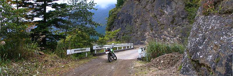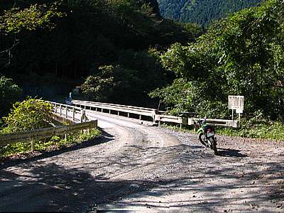 | 13時26分 西俣川に架かる名無し橋。 ここまで舗装だった道はここから未舗装路へと変わっていく。 |