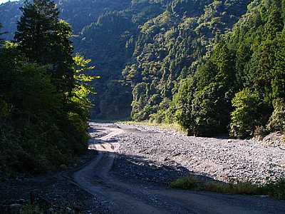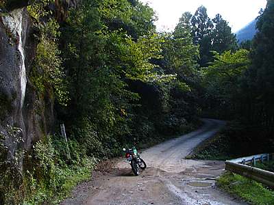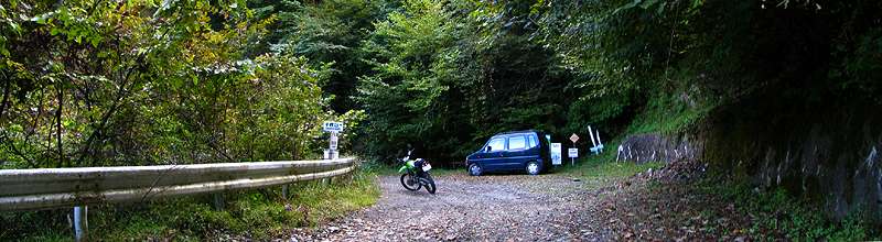 | 15時22分 月夜の段へ到着。 ちなみに「段」は山の中の平な部分を指すという。 つまり、昼でも月明かりくらいの光しか射さない場所、というのが月夜の段の意味だそうだ。 なるほど確かに周囲は平坦な地になっている。 今でこそ或る程度伐採がなされ薄暗さはそれほど感じないが、しかし車道としての剣抜大洞線が出来たのは昭和60年代以降のことである。それ以前は人が足を踏み入れることさえ滅多にない場所だったに違いない。 |