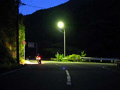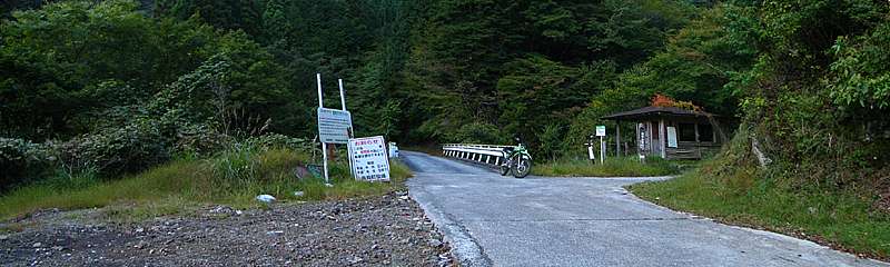 | 17時40分 県道802号の徳間バス停↑で左折して石合橋→へ。 写真では明るく見えるが、実際にはすっかり暗くなっている。 ちなみにこの石合橋を右折すると県道801号となり、石合線や貫ヶ岳西線へと続いていく。 終点から静岡県までは約2キロ。 あと少しで県境越えとなるところだが、残念ながら樽峠の手前で道は終わっている。 |