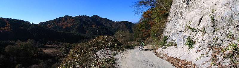 | 2007年11月23日。 ここ何日か素晴らしい青空が続いている。 当日も朝からの快晴。 久しぶりに京戸岩崎山林道へ行ってみることにした。 午前11時10分。 県道6号を東進して北中学校入口交差点。 3連休の初日ということもあり、道はいつもより混んでいる。 |