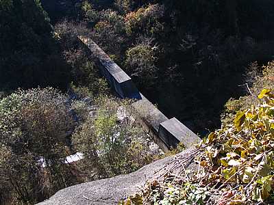 午後1時01分 前半はさしたる景色もなく京戸川に沿って上っていく。 高低差はどのくらいだろうか。 完全な落下道ではないので高さはそれほど感じないが、ちょっと見ただけでも40mから50mくらいはありそうだ。 |