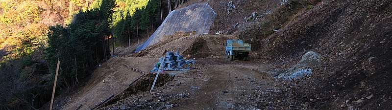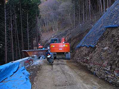 | 午後3時10分 開設現場の近くまでやってきた。 終点間際には道幅いっぱいにブルドーザーが停められており、これ以上バイクで進むのは難しそうだ。 ということで、ここからは徒歩で行ってることにした。 |