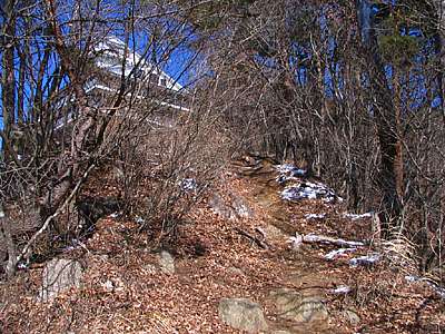 | 午後1時05分 登山初心者なのでアイゼンなど持っているはずもありません。 無理をしないことが信条なので、進むべきか戻るべきか、を考えるまでもなく引き返すことを即決です。 ただ天気は快晴。このまま終えてしまうのも惜しいので、少々変則的にはなるものの逆のツク坂峠(穴口峠)側から歩いてみることにしました。 |