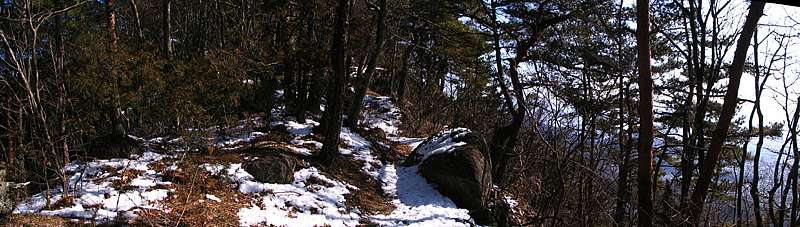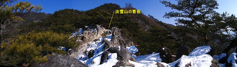 | 午後12時40分 なんとか淡雪山790mへ到着(本当に790m?)。 この両側の切れ落ちた道は僅か数10m程度ですが、一歩ごとに足場を確認しながら進んだため5分も掛かってしまいました。 ちなみに名前の由来は「白砂で雪をまとったように見える」ということから名付けられたようですが、山というより尾根の途中にある単なる花崗岩の道、といったような場所で、看板がなければ山と気がつかずに通り過ぎてしまうことでしょう。 なお当日はここまで22分も要してしまいましたが、普通なら5分から10分で登れてしまうと思います。 |