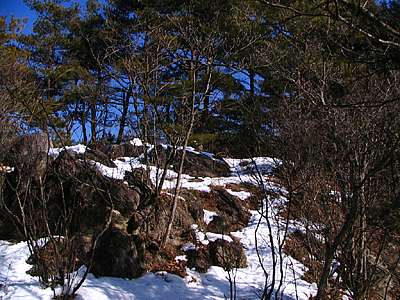 | 午後12時21分 登山道の勾配は大きめで、場所によっては岩場を乗り越えるようにして進みます。 ただ手を使ってよじ登るような大岩ではないので難しいようなことはありません。 |