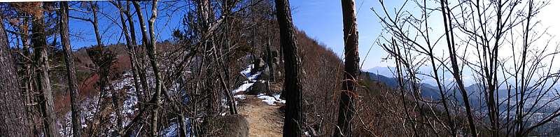 午後12時47分 上りとなった道は東へと向かいます。 一見すると右手に眺望が広がっているかに思えますが、実際には木々を通して盆地がチラチラと見える程度です。 |