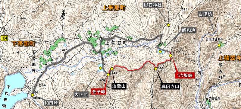 | 午後12時09分 バス終点の1つ手前の仲原バス停。 下帯那町から上帯那町へ入り、目的地である淡雪山790mと興因寺山854.5mが見えてきました。 淡雪山の登り口は大正池の先にある金子峠。 興因寺山の登り口は昭和池の先にあるツク坂峠(穴口峠)。 登山道で繋がっているのでどちらから登っても構わないのですが、今回は淡雪山の金子峠側から登ります。 |