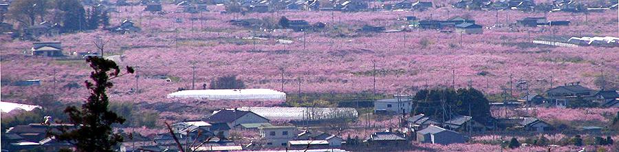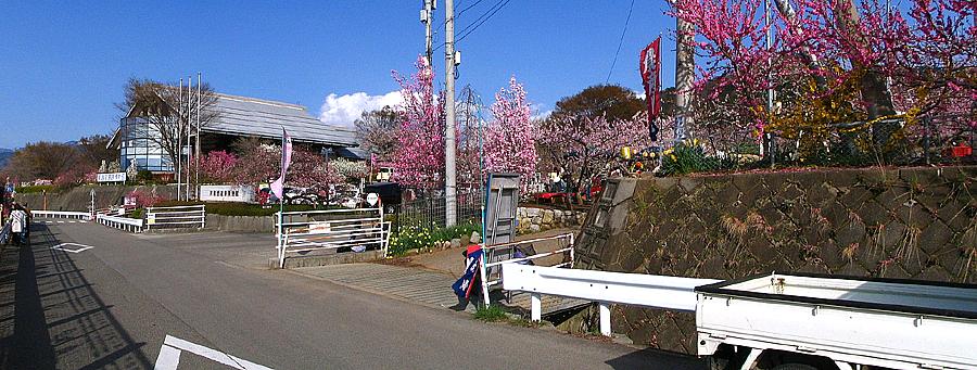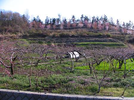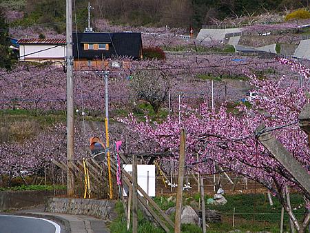 さて釈迦堂遺跡博物館からは、いつもの「お花見台」へと向かうことにする。 県道34号沿いの桃の花もほぼ満開。 わざわざ高台へ上らなくても、県道を走るだけで周辺には色鮮やかな桃畑が一面に広がっている。 |