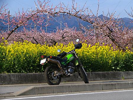 | 山梨市の正徳寺あたり。 桃の花と菜の花が綺麗だったのでUターンして撮影。 ちなみに山梨市方向の西へと向かっているのだが、Uターンしたのでバイクは逆向き。