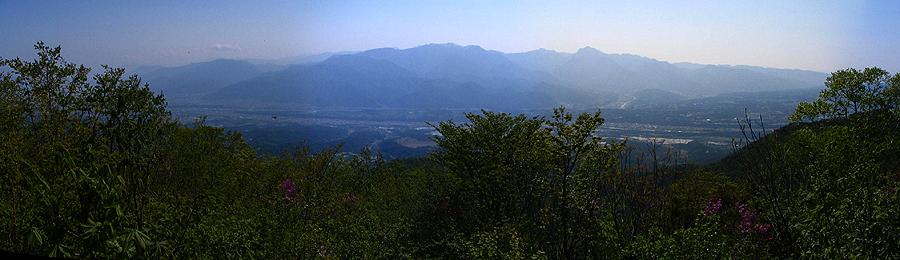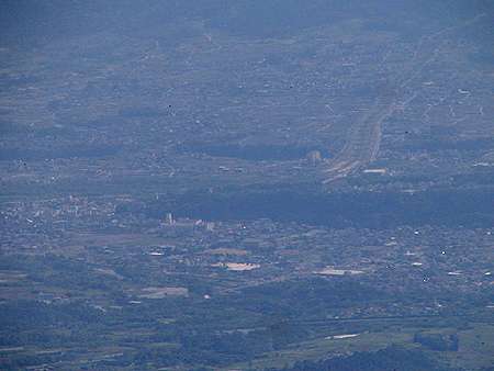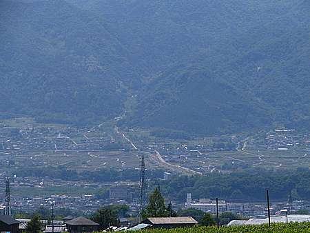 | 午後14時2分 こちらは盆地側の景色。 右側を流れるのは市川三郷町へと続く釜無川だ。 残念ながら富士山は薄雲に隠れてしまったが、中央市を正面にその周辺市町村が良く見てとれる。 |