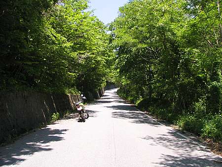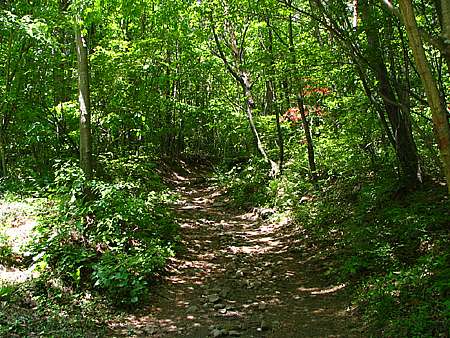 | 午後12時50分 鬱蒼とした樹林帯の中に続く道。 景色はないが、森林浴たっぷりで極めて爽快だ。 |