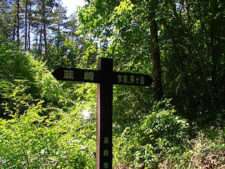午後13時54分 尾根っぽい場所へとやって来た。 山頂か?と思ったら単なる分岐点だった。 ちなみに同地点には標識が立っている。 山頂へは左に折れ、右に曲がると敷島町へと行くらしい。 |