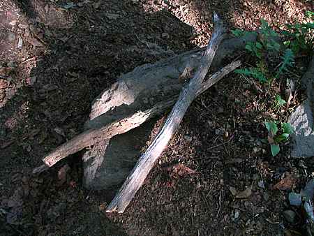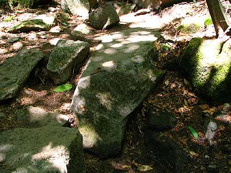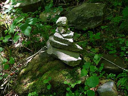 | 午後13時00分 道横のケルン。 こういった積み石はこの先でも至る所で目にすることになる。 先に登った登山者が後者の為に建てたものだそうで、賽の河原の積み石とは意味合いが違うそうだ。 |