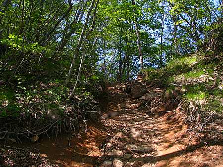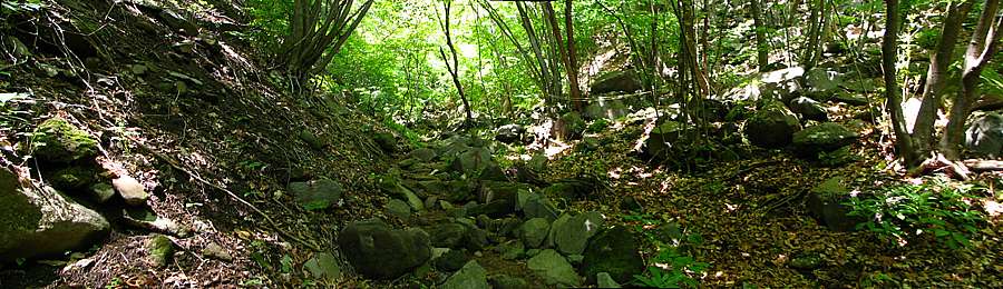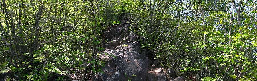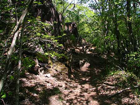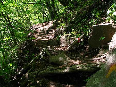 午後13時15分 この辺りからは急登。 急傾斜の道には大きな岩がゴロゴロと転がっている。 既に息ゼーゼー。 一瞬、引き返そうか、とも考える。 |