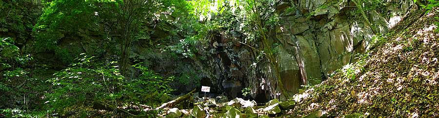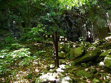 | 午後13時19分 高さは20mくらいだろうか。 正面は花崗岩で出来たどん詰まりの岩壁だ。 岩壁の前には「女岩」と書かれた標識が立っている。 |