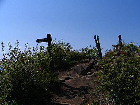 午後14時29分 ん?着いた? 登り始めて1時間44分で山頂へ到着。 が、なんだか感動が薄い.......なんでだろう。 広さは10m四方くらいだろうか。 切り開かれた山頂に大きな木は1本もない。 このため360度の景色を見渡せるが、夏は日影がないので暑そうだ。 山頂には既にお二人の方が陣取られていた。 挨拶をしたが返事がなかったので、その後に言葉を交わすことはなかった。 |