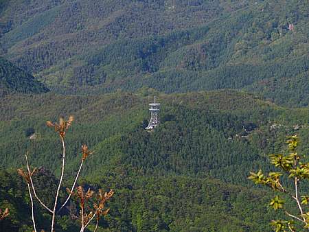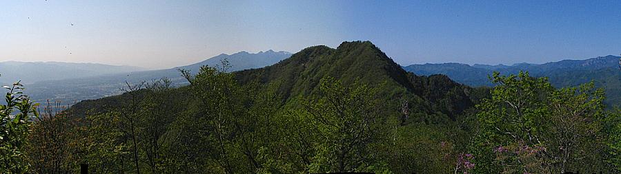 | 午後14時55分 こちらは北西から北東にかけての景色。 金峰山を中心に瑞垣山、国師ヶ岳、乾徳山といった名だたる山々が連なっている。 眼下に見おろすのは観音峠の近くに建つ無線中継所。 観音峠側からも茅ヶ岳や金ヶ岳への登山道が上っており、観音峠大野山線沿いには案内板も立っている。 |