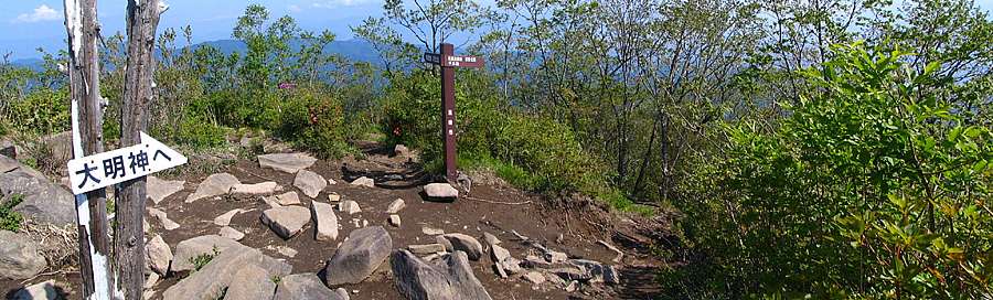 | 午後12時41分 前山大明神林道からの登り口。 同地点は十字路になっており、左からの道が深田記念公園から上ってくる道になっている。 標高は1060m前後だろうか。 ショートカットする距離は約1キロで、時間的には20分くらいは短縮できそうだ。 ちなみに車は30mほど先に数台分、更に300mほど進むと10台分くらいのスペースが設けられている。 当日は1台の車が停まっているだけだったので、よほどの混雑期でなければ駐車できると思われる。 |